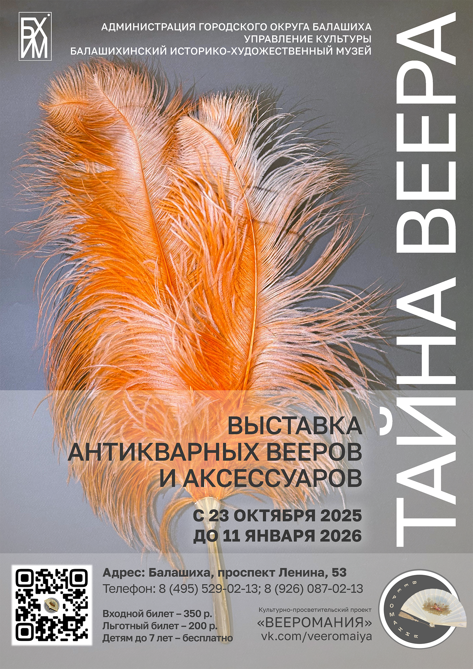Балашихинский историко-художественный музей совместно с культурно-просветительским проектом «Вееромания» приглашает посетить выставку «Тайна веера», где будут представлены старинные веера из частных коллекций Екатерины Животовской и Екатерины Россан. На выставке представлено около 100 экспонатов — веера XVIII — XX веков, печатные и живописные, из шелка, перьев, кости, перламутра, черепахового панциря, изделия из бисера и кружева, парфюмерные флаконы и многое другое.
