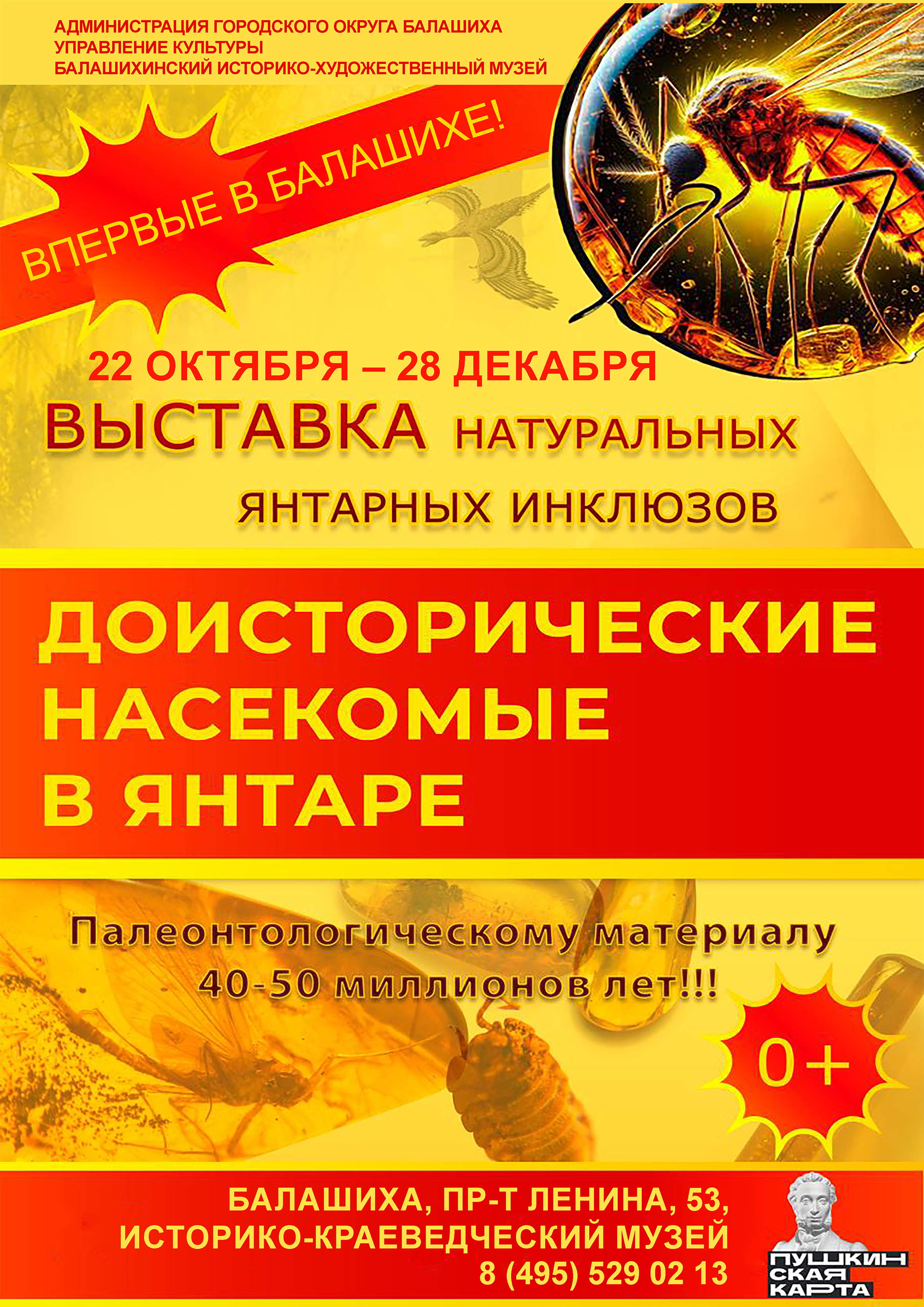 Балашихинский историко-художественный музей (проспект Ленина, 53) приглашает Вас на знаменитую выставку натуральных янтарных инклюзов «Доисторические насекомые в янтаре» с новыми экспонатами, впервые привезенными в Балашиху. На выставке Вы увидите чрезвычайно редкие и удивительно красивые янтарные самородки с включением членистоногих, живших на Земле около 500 000 веков назад!